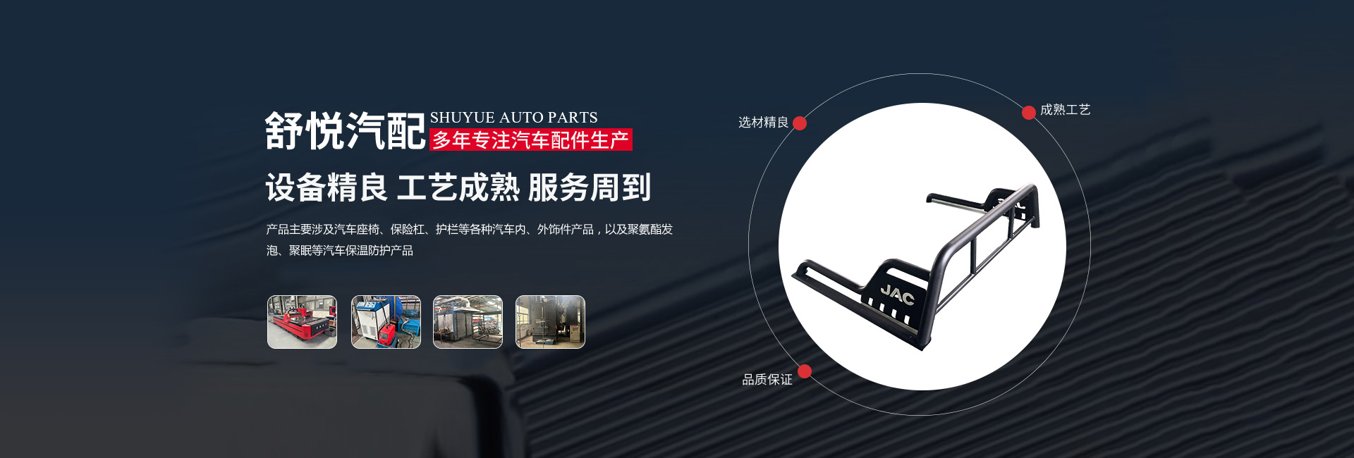 揚州舒悅汽配有限公司經過多年的穩(wěn)定發(fā)展,業(yè)績一直蒸蒸日上。公司產品主要涉及汽車座椅、保險杠、護欄等各種汽車內、外飾件產品,以及聚氨酯發(fā)泡、聚脲等汽車保溫防護產品。其主要是為江淮、金龍,奇瑞等公司服務,已連續(xù)多年成為江淮、金龍等公司的A級供應商。        公司成立于1997年,現坐落于揚州市儀征劉集盤古工業(yè)集中區(qū)202號,公司占地面積26640平 方米,廠房建筑面積18512平方米。公司擁有先進的制造設備、可靠的生產工藝、完善的檢測手段和科學的管理,在售前和售后服務中做到快速反應,應急應變,為客戶提供優(yōu)良產品和滿意服務。公司的產品開發(fā)能力和生產規(guī)模在同行業(yè)中處于前列的地位。        揚州舒悅人秉承“誠信雙嬴”的原則,發(fā)揚“誠信、務實、創(chuàng)新、貢獻”的企業(yè)精神,恪守“顧客至上”的經營宗旨,致精從業(yè),不斷引進新技術、新材料。以優(yōu)良的產品、合理的價格和周到的服務參與市場競爭。公司愿與國內外朋友建立真誠的合作伙伴關系,攜手共創(chuàng)輝煌!